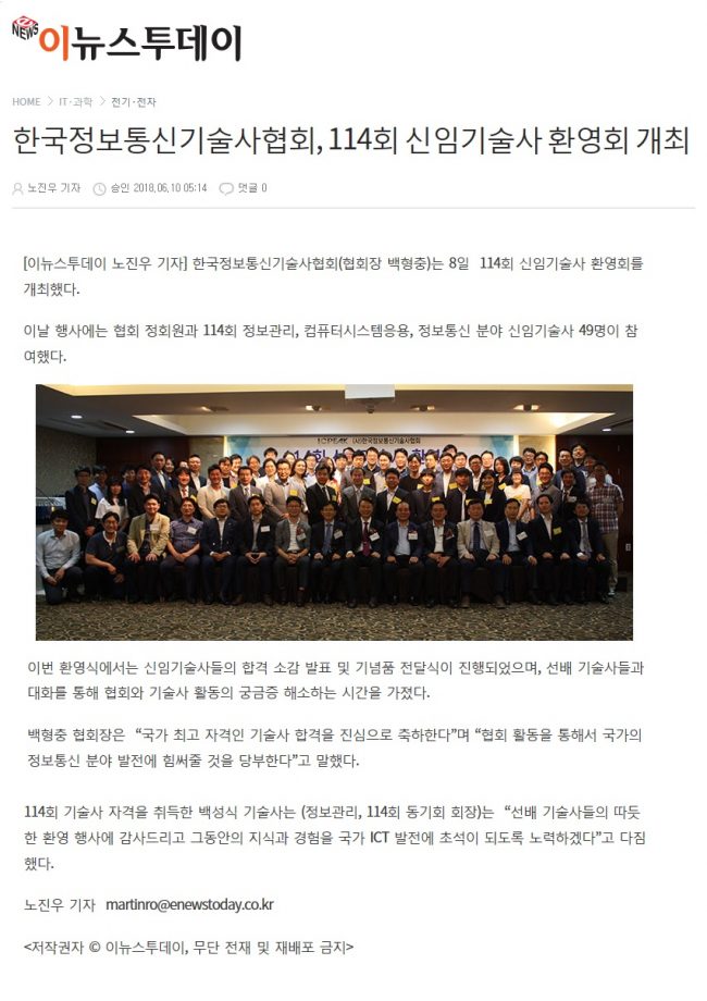 2018년 6월 10일 이뉴스투데이 “한국정보통신기술사협회, 114회 신임기술사 환영회 개최”