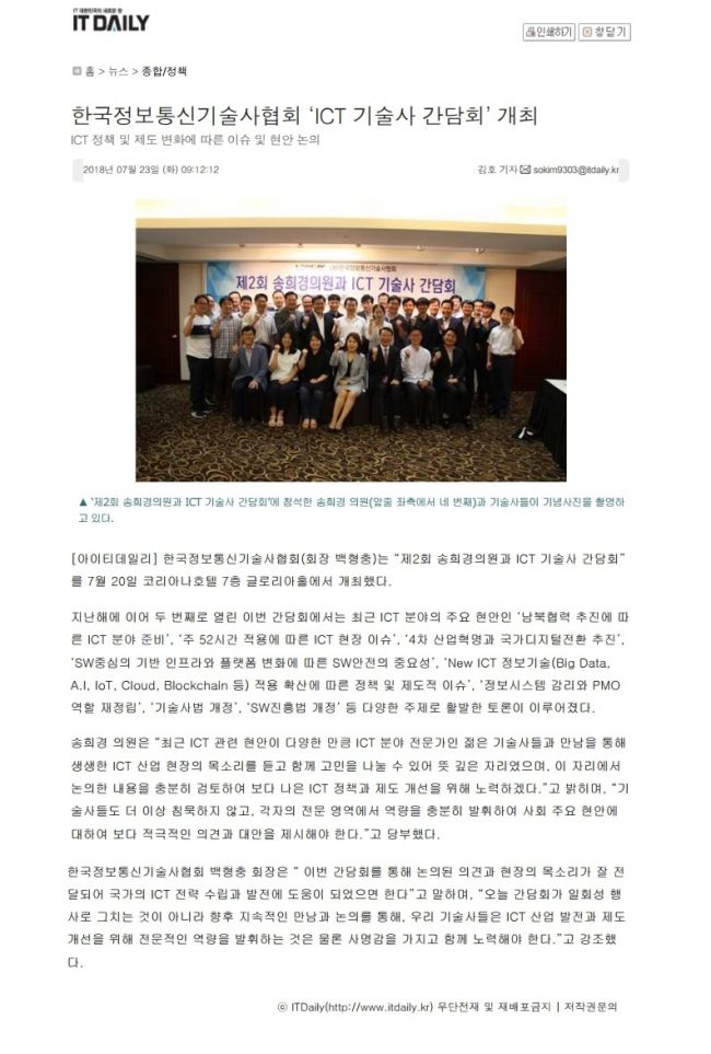2018년 7월 23일 아이티데일리”한국정보통신기술사협회 ICT기술사 간담회 개최” 보도자료By 한국정보공학기술사회2018년 7월 23일Leave a comment기사 링크 : http://www.itdaily.kr/news/articlePrint.html?idxno=90151