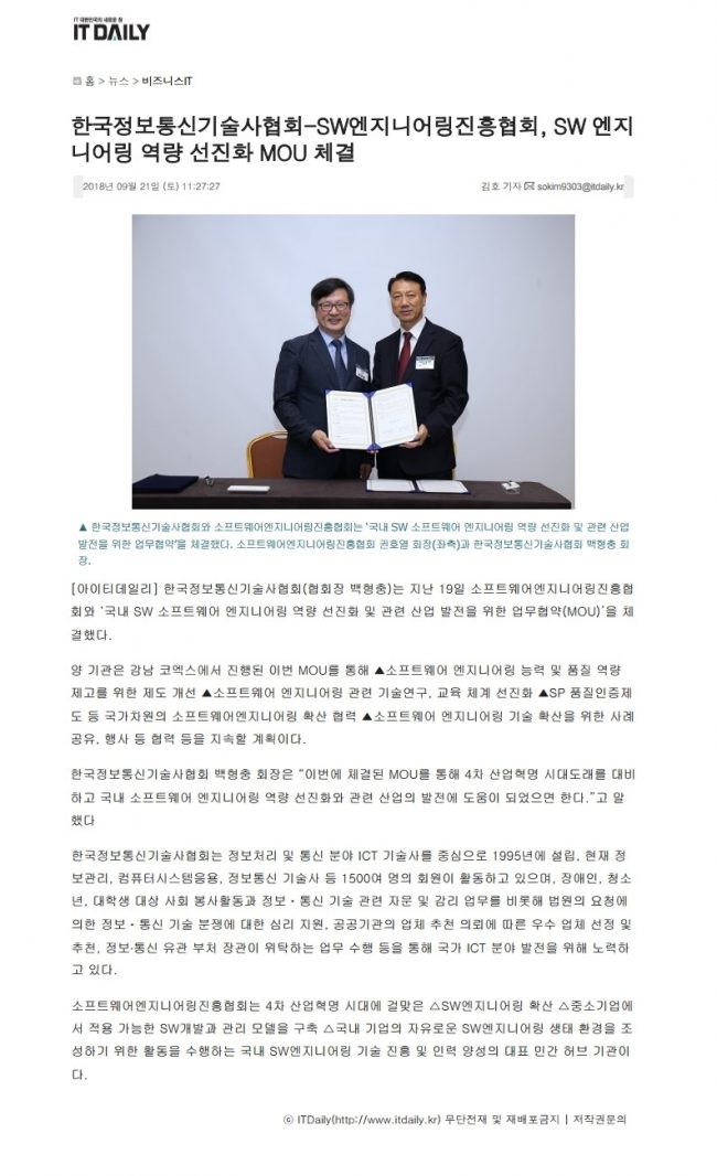 2018년 9월 21일 아이티데일리/ 한국정보통신기술사협회-SW엔지니어링진흥협회, SW엔지니어링 역량 선진화 MOU 체결
