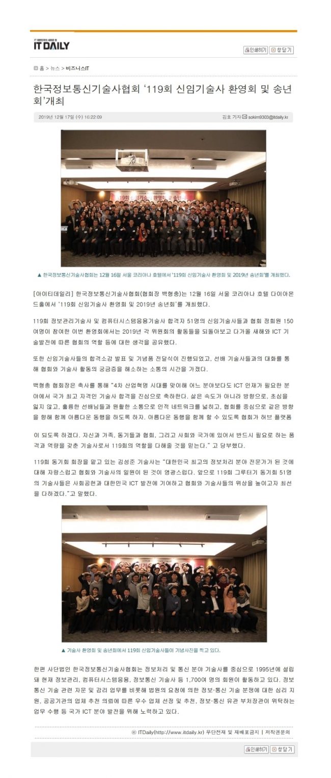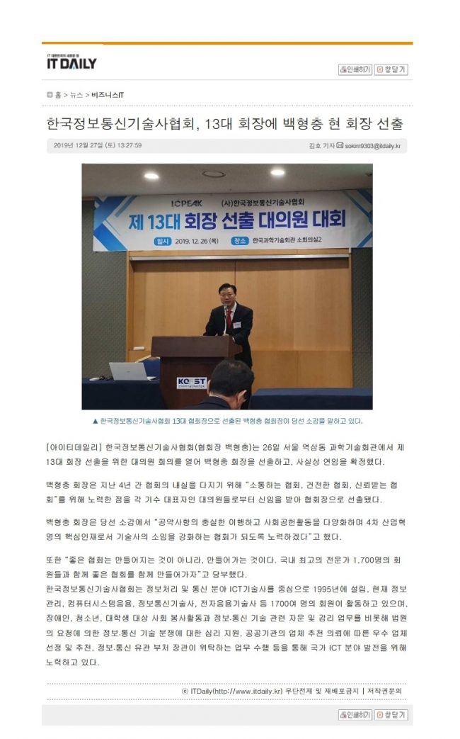 안녕하십니까? 정관 및 임원선출규정에 의거하여 실시한 회장 선출 대의원 대회 결과를 알려 드립니다. – 다 음 – 1. 대회일시 : 2019년 12월 26일 (목요일) 19:00 ~ 2. 대의원수 : 총 119명 3. 총 참석인원 : 113명 (참석 58명, 위임장제출 55명) 4. 대회장소 : 한국과학기술회관 지하1층 소회의실2 5. 결 과 : 71회 백형충 기술사를 13대…