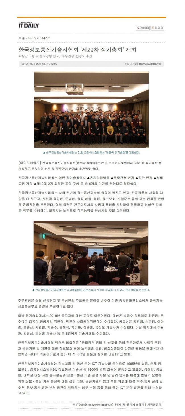 2019년 2월 22일 아이티데일리 “제29차 정기총회 개최”