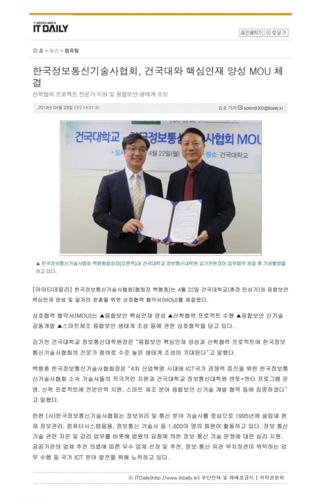 2019년 4월 23일 아이티데일리 “건국대와 핵심인재 양성 MOU 체결” 보도자료By 한국정보공학기술사회2019년 4월 26일Leave a comment기사 링크 : http://www.itdaily.kr/news/articleView.html?idxno=94308