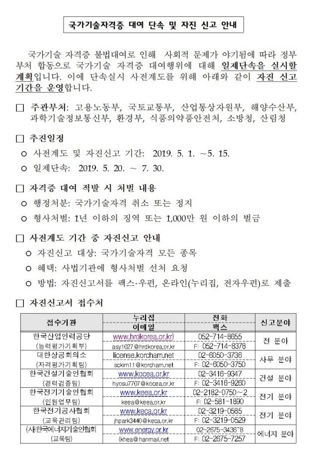 국가기술자격증 불법대여 합동 단속 안내