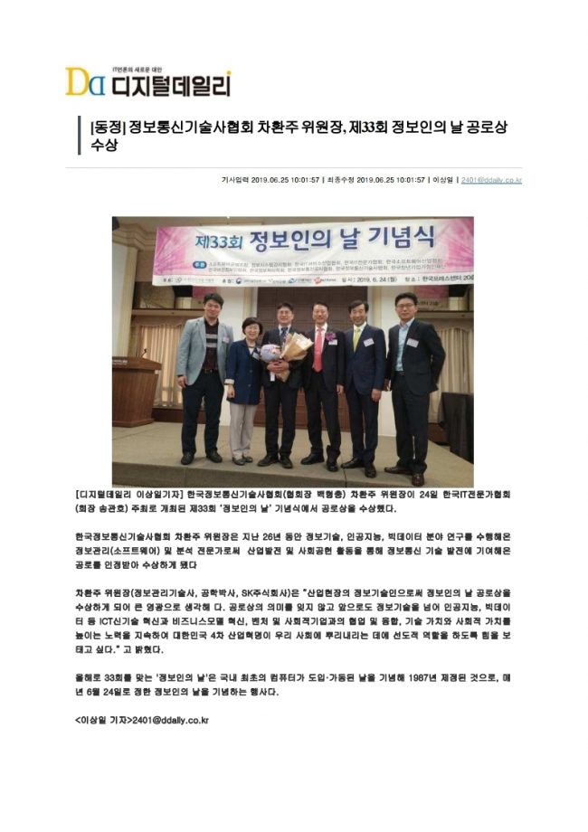 2019년 6월 25일 디지털데일리 “차환주 위원장, 제33회 정보인의 날 공로상 수상” 보도자료By 한국정보공학기술사회2019년 6월 25일Leave a comment기사 링크 : http://www.ddaily.co.kr/news/article/?no=182818