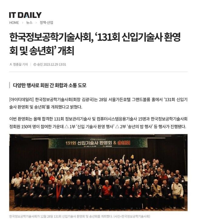 2023년 12월 29일 아이티데일리 “131회 신입기술사 환영회 및 송년회 개최” 보도자료By 한국정보공학기술사회2023년 12월 29일Leave a comment기사 링크 : http://www.itdaily.kr/news/articleView.html?idxno=219217