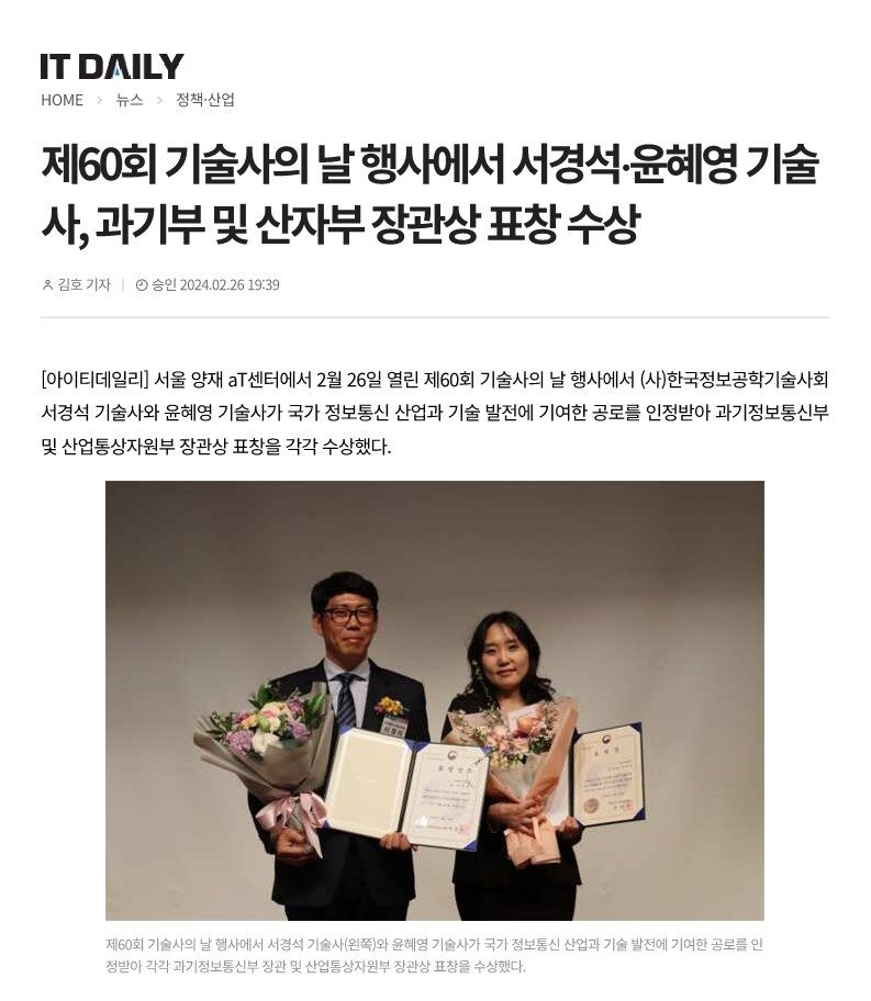 2월262024보도자료 기사 링크 : http://www.itdaily.kr/news/articleView.html?idxno=220722 Category: 보도자료By 한국정보공학기술사회2024년 2월 26일Leave a comment Author: 한국정보공학기술사회 Post navigationPreviousPrevious post:[마감/50명신청] IBK시스템 ‘스마트뱅킹 전면 개편 추진’ 평가위원 후보자 모집 (19일,월/18시 마감)NextNext post:2024년 3월 4일 아이티데일리 “제34차 정기총회 개최”관련 글2025년 2월 27일 아이티데일리 “정보공학기술사회, 제35차 정기총회 및 회장 이·취임식 개최”2025년 2월 27일2025년 2월 27일 보안뉴스 “정보공학기술사회, AI기본법 정책자문 강화할 터”2025년 2월 27일2025년 2월 26일 아이티데일리 “60주년 기념 기술사의 날 이운교, 김홍진, 오석재 기술사 과기부 및 산자부 장관상 수상”2025년 2월 26일2025년 2월 17일 보안뉴스 “잘 키운 ‘보안인재’ 해외 유출 골머리.. 기술사회가 꼽은 보안 이슈”2025년 2월 17일2025년 1월 20일 아이티데일리 “한국정보공학기술사회, ‘한국인공지능 컨세서스 세미나’ 참여”2025년 1월 20일2025년 1월 13일 아이티데일리 “한국정보공학기술사회, ‘제10기 신입기술사 평생회원 연수’ 개최”2025년 1월 13일