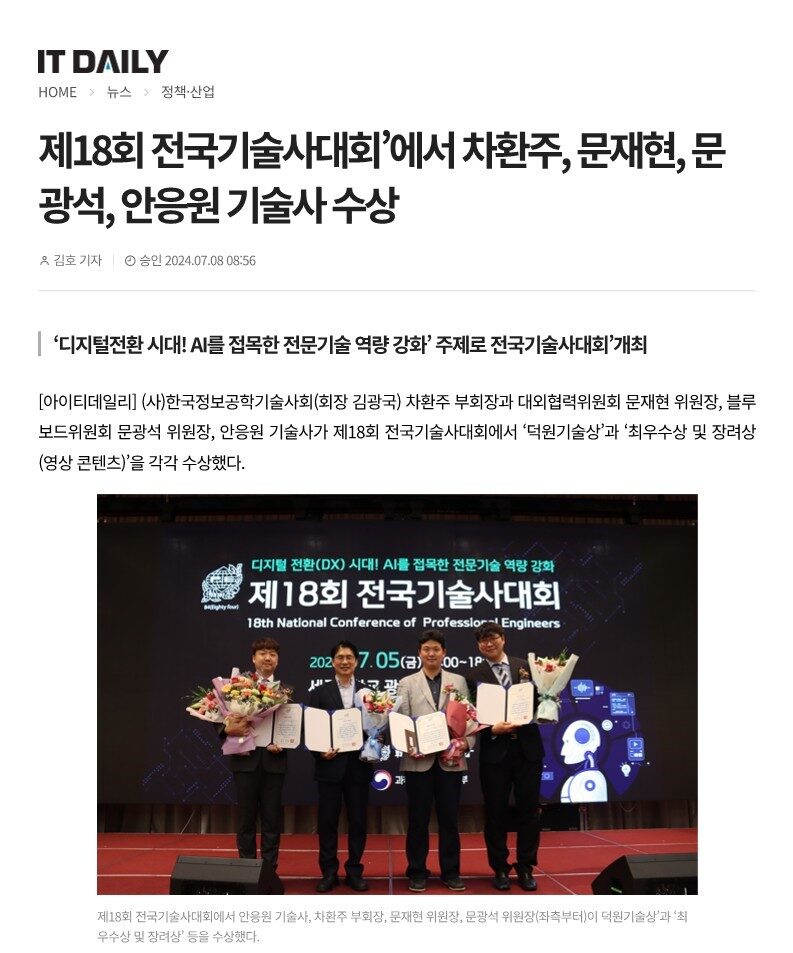 7월82024보도자료 기사 링크 : http://www.itdaily.kr/news/articleView.html?idxno=224916 Category: 보도자료By 한국정보공학기술사회2024년 7월 8일Leave a comment Author: 한국정보공학기술사회 Post navigationPreviousPrevious post:[마감/38명신청]항공안전기술원 평가위원 추천 요청(2일 화,15시마감)NextNext post:[마감/36명신청] IBK시스템 ‘ 기업은행 WIN CLASS 시스템 재구축’ 평가위원 후보자 모집 (19일,금/14시 마감)관련 글2025년 2월 27일 아이티데일리 “정보공학기술사회, 제35차 정기총회 및 회장 이·취임식 개최”2025년 2월 27일2025년 2월 27일 보안뉴스 “정보공학기술사회, AI기본법 정책자문 강화할 터”2025년 2월 27일2025년 2월 26일 아이티데일리 “60주년 기념 기술사의 날 이운교, 김홍진, 오석재 기술사 과기부 및 산자부 장관상 수상”2025년 2월 26일2025년 2월 17일 보안뉴스 “잘 키운 ‘보안인재’ 해외 유출 골머리.. 기술사회가 꼽은 보안 이슈”2025년 2월 17일2025년 1월 20일 아이티데일리 “한국정보공학기술사회, ‘한국인공지능 컨세서스 세미나’ 참여”2025년 1월 20일2025년 1월 13일 아이티데일리 “한국정보공학기술사회, ‘제10기 신입기술사 평생회원 연수’ 개최”2025년 1월 13일