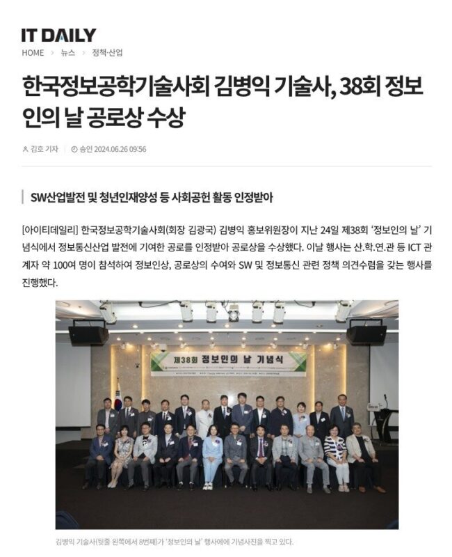 2024년 6월 26일 아이티데일리 “김병익 기술사, 38회 정보인의 날 공로상 수상” 보도자료By 한국정보공학기술사회2024년 6월 26일Leave a comment기사 링크 : http://www.itdaily.kr/news/articleView.html?idxno=224464