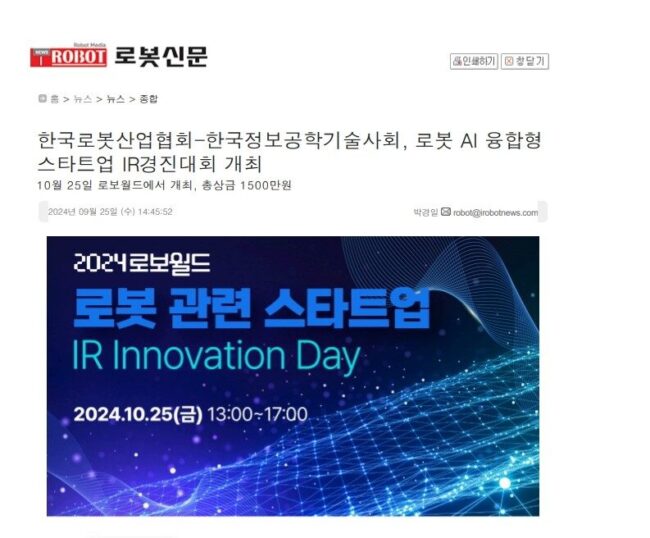 2024년 9월 25일 로봇신문 “한국로봇산업협회-한국정보공학기술사회, 로봇 AI융합형 스타트업 IR경진대회 개최” 보도자료By 한국정보공학기술사회2024년 9월 25일Leave a comment기사 링크 : https://www.irobotnews.com/news/articleView.html?idxno=36164