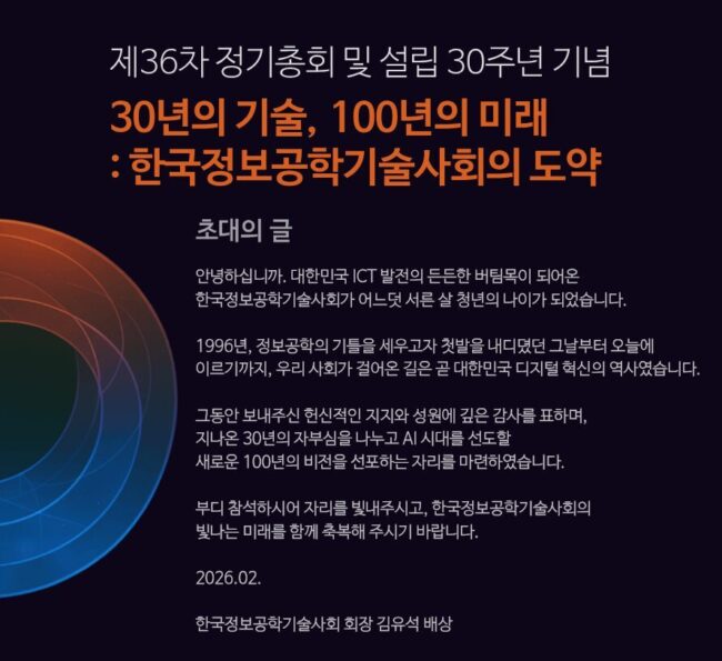 안녕하세요 한국정보공학기술사회 사무국입니다. 우리 회는 3월 6일 (금) 서울가든호텔에서 제36차 정기총회 및 30주년 기념식을 개최합니다. 회원 여러분의 많은 관심과 참여 바랍니다. ♣ 참석신청 : 2026.2.26.(목) 18시까지 ♣ 신청방법 1.하단의 초대장의 참석신청 이미지를 클릭 2.참석신청 URL : https://forms.gle/gMbRXxLzRKjAktDh7