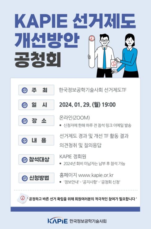 1월182024 [마감] KAPIE 선거제도 개선방안 공청회 안내(26일 금,18시 마감) 공지사항By 한국정보공학기술사회2024년 1월 18일Leave a comment Details