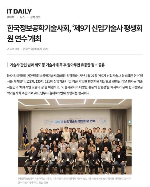 1월292024 2024년 1월 29일 아이티데일리 “제9기 신입기술사 평생회원 연수 개최” 보도자료By 한국정보공학기술사회2024년 1월 29일Leave a comment Details