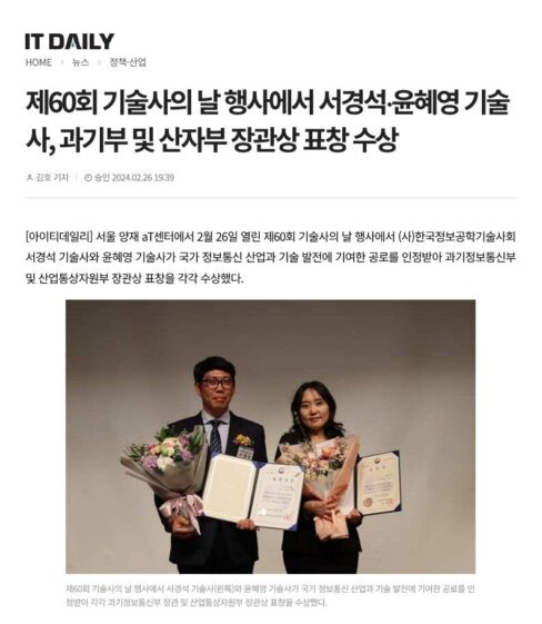 2월262024 2024년 2월 26일 아이티데일리 “제60회 기술사의 날, 서경석·윤혜영 기술사 과기부 및 산자부 장관 표창 수상” 보도자료By 한국정보공학기술사회2024년 2월 26일Leave a comment Details