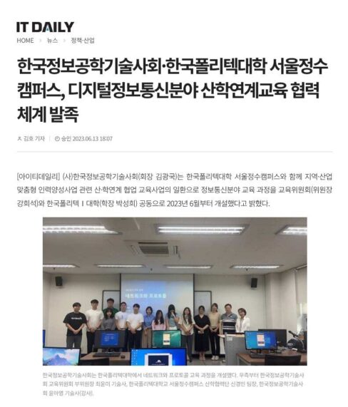 6월132023 2023년 6월 13일 아이티데일리 “한국폴리텍대학 정수캠퍼스와 디지털정보통신분야 산학연계교육 협력 체계 발족” 보도자료By 한국정보공학기술사회2023년 6월 13일Leave a comment Details