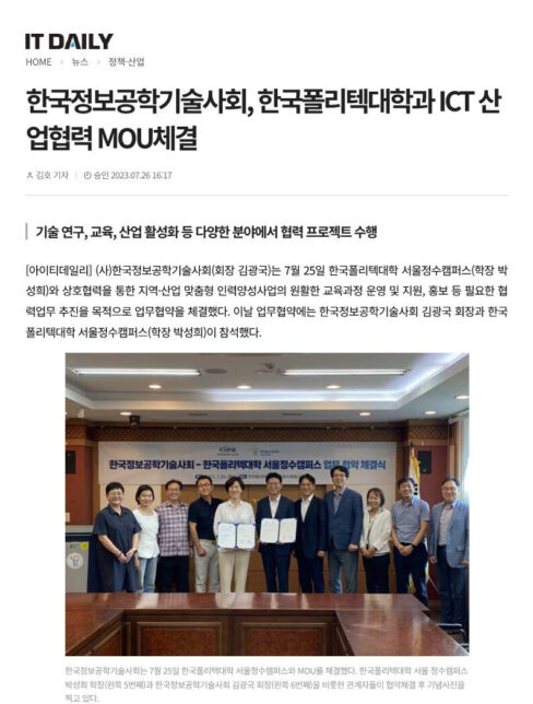 7월272023 2023년 7월 26일 아이티데일리 “한국폴리텍대학과 ICT산업협력 MOU 체결” 보도자료By 한국정보공학기술사회2023년 7월 27일Leave a comment Details