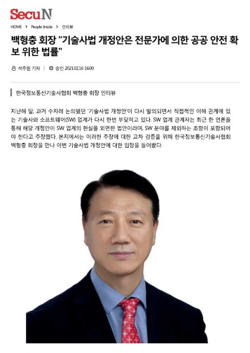 2월172021 2021년 2월 16일 CCTV뉴스 “백형충 회장 “기술사법 개정안은 전문가에 의한 공공 안전 확보 위한 법률”” 보도자료By 한국정보공학기술사회2021년 2월 17일Leave a comment Details