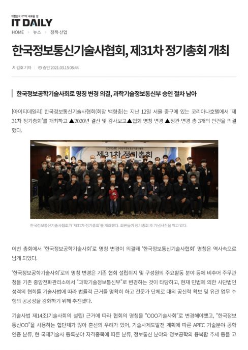 3월172021 2021년 3월 15일 아이티데일리 “한국정보통신기술사협회, 제31차 정기총회 개최” 보도자료By 한국정보공학기술사회2021년 3월 17일Leave a comment Details