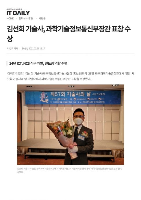 2월272021 2021년 2월 26일 아이티데일리 “김선희 기술사, 과학기술정보통신부장관 표창 수상” 보도자료By 한국정보공학기술사회2021년 2월 27일Leave a comment Details