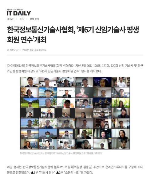 3월112021 2021년 3월 11일 아이티데일리 “한국정보통신기술사협회, 제6기 신입기술사 평생회원 연수 개최” 보도자료By 한국정보공학기술사회2021년 3월 11일Leave a comment Details