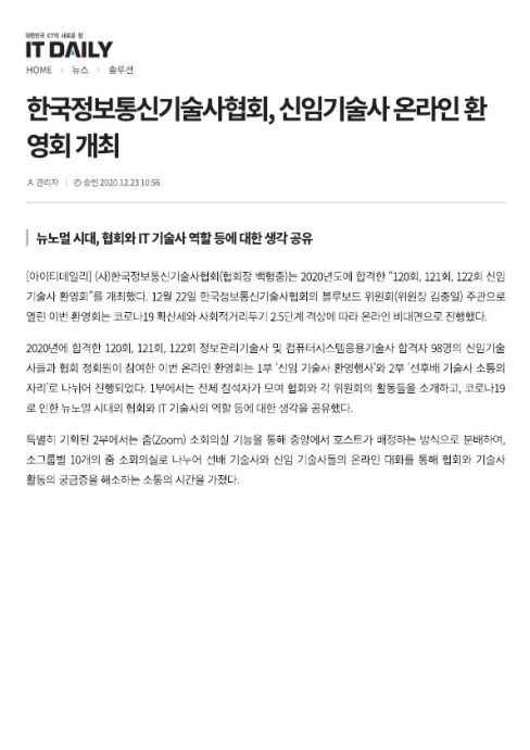 12월232020 2020년 12월 23일 아이티데일리 “한국정보통신기술사협회, 신입기술사 온라인 환영회 개최” 보도자료By 한국정보공학기술사회2020년 12월 23일Leave a comment Details