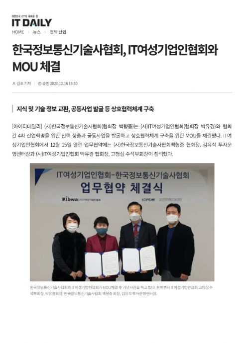 12월172020 2020년 12월 16일 아이디데일리 “한국정보통신기술사협회, IT여성기업인협회와 MOU 체결” 보도자료By 한국정보공학기술사회2020년 12월 17일Leave a comment Details
