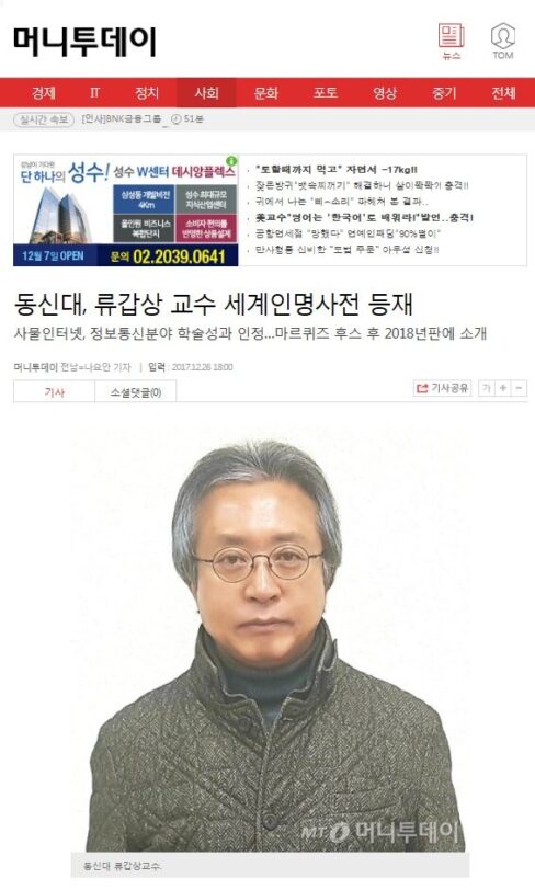12월272017 2017년 12월 26일 머니투데이 “동신대, 류갑상 교수 세계인명사전 등재” 보도자료By 한국정보공학기술사회2017년 12월 27일Leave a comment Details