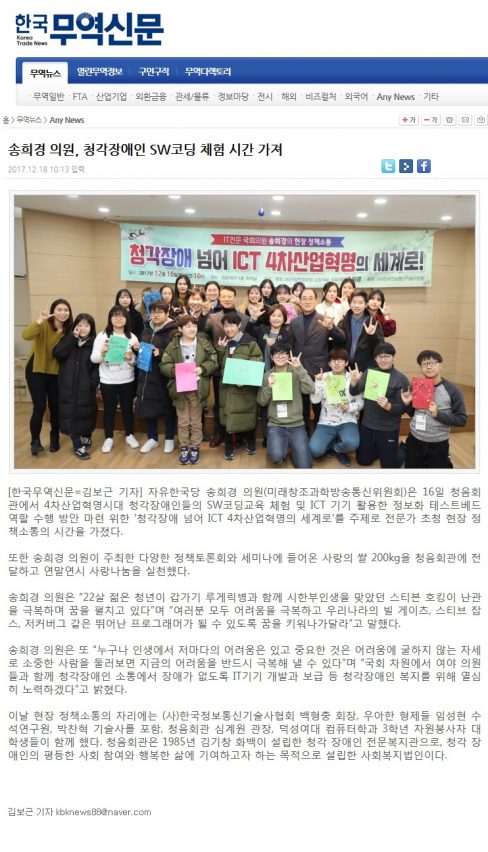 12월182017 2017년 12월 18일 한국무역신문 “송희경 의원, 청각장애인 SW코딩 체험 시간 가져” 보도자료By 한국정보공학기술사회2017년 12월 18일Leave a comment Details
