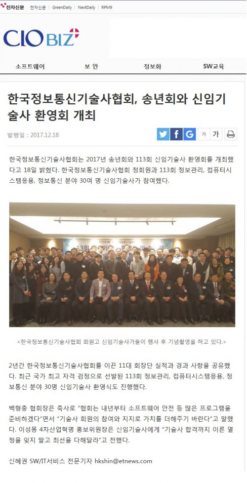 12월192017 2017년 12월 18일 전자신문”송년회와 신임기술사 환영회 개최” 보도자료By 한국정보공학기술사회2017년 12월 19일Leave a comment Details
